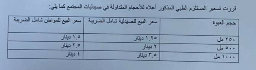 وحددت المؤسسة سعر بيع الكحول الطبي للمواطنين شاملا ضريبة المبيعات، بين 1.5 و4 دنانير حسب حجم العبوة.