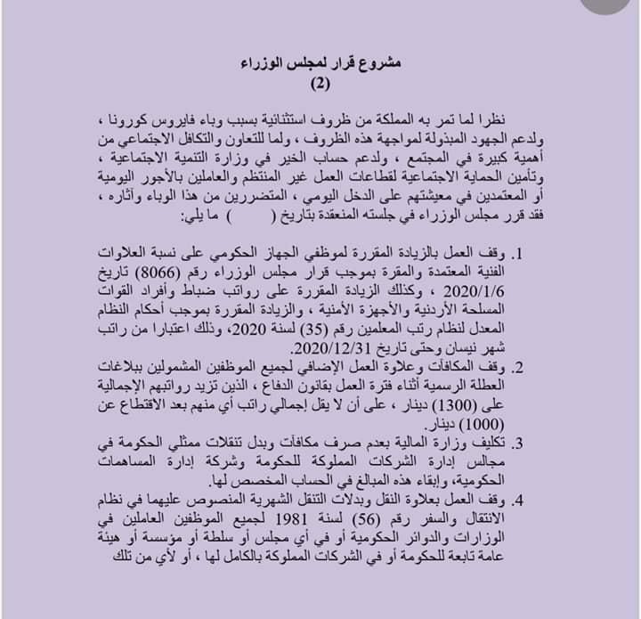 1. وقف العمل بالزيادة المقررة لموظفي الجهاز الحكومي على نسبة العلاوات الفنية المعتمدة والمقرة بموجب قرار مجلس الوزراء رقم (8066) تاريخ 6/1/2020 ، وكذلك الزيادة المقررة على رواتب ضباط وأفراد القوات المسلحة الأردنية والأجهزة الأمنية ، والزيادة المقررة بموجب أحكام النظام المعدل لنظام رتب المعلمين رقم (35) لسنة 2020، وذلك اعتبارا من راتب شهر نيسان وحتى تاريخ 31/12/2020.