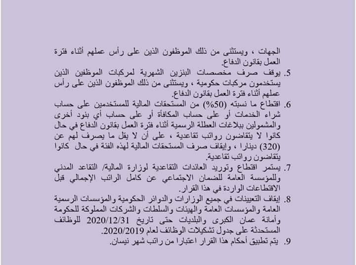 8. إيقاف التعيينات في جميع الوزارات والدوائر الحكومية والمؤسسات الرسمية العامة والمؤسسات العامة والهيئات والسلطات والشركات المملوكة للحكومة وأمانة عمان الكبرى والبلديات حتى تاريخ 31/12/2020 للوظائف المستحدثة على جدول تشكيلات الوظائف لعام 2019/2020.