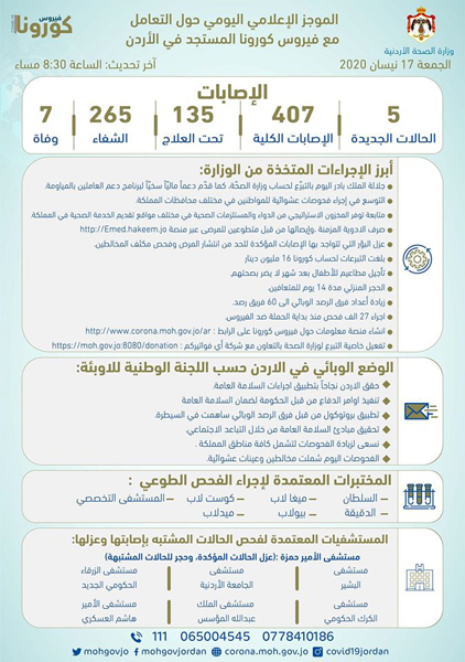 أحداث اليوم - قالت وزارة الصحة انها اجرت 27 الف فحص لفيروس كورونا منذ بدء الازمة.وبينت في اليوم الجمعة ، انه تم التوسع بإجراء الفحوصات العشوائية في المحافظات.وأشارت الى ان مجموع التبرعات لحساب الوزارة بلغ 16 مليون دينار.