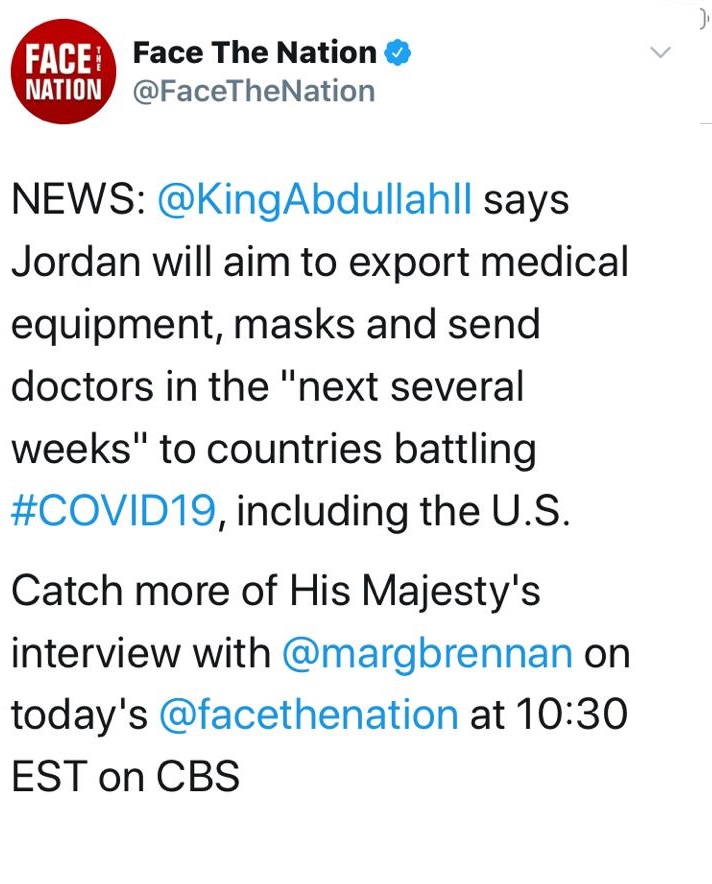 وبين الملك خلال مقابلة مع قناة سي بي سي الامريكية انه في الأسابيع القليلة المقبلة سيتم تصدير هذه المعدات إلى البلدان التي تكافح فيروس كورونا المستجد بما فيها الولايات المتحدة.