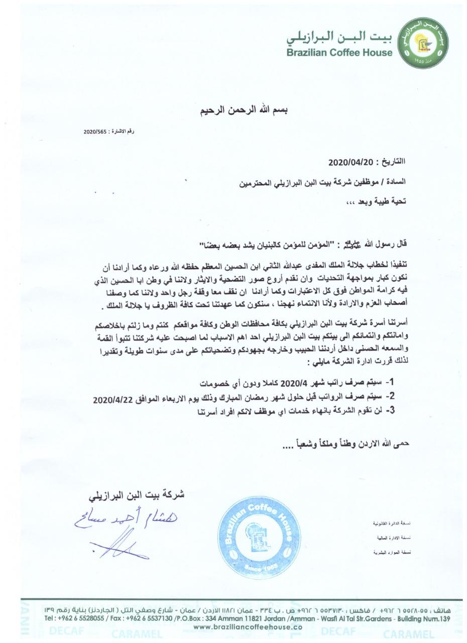 وعلى ذات الصعيد قررت الشركة صرف راتب شهر 4 لموظفيها دون أي خصومات قبل حلول شهر رمضان المبارك، ولن يتم انهاء خدمات أي موظف.