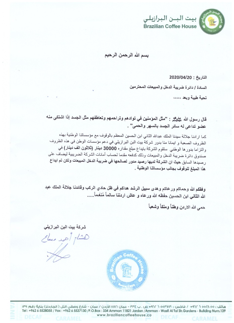 قامت شركة بيت البن البرازيل والتزاما بدورها الوطني بمبادرة رائدة، بأن اودعت مبلغ قدرة 30000 دينار في صندوق دائرة ضريبة الدخل والمبيعات، ليضاف على رصيدها السابق المدور.