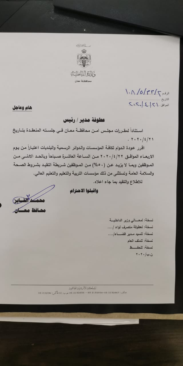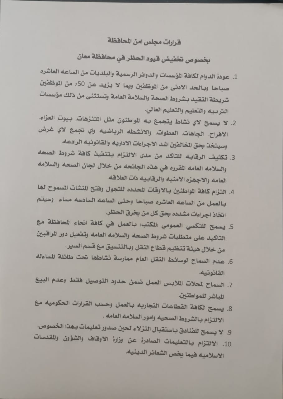 وجاءت هذه القرارات انسجاما مع القرارات الحكومية الصادرة بتخفيض بعض قيود حظر التجول في عدد من محافظات المملكة، ولتنظيم هذه العملية ومتابعتها.