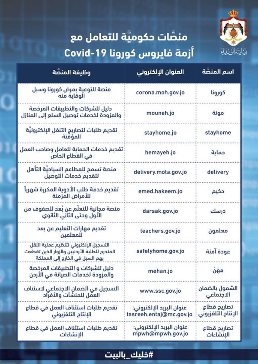 وتشمل المنصات التوعية بمرض فيروس كورونا واصدار التصاريح للقطاعات وطلبات المواد التموينية للمنازل وطلبات الادوية والتعليم عن بعد وحماية موظفي القطاع العام وغيرها من الخدمات الحكومية للتسهيل على المواطنين خلال حظر التجول.