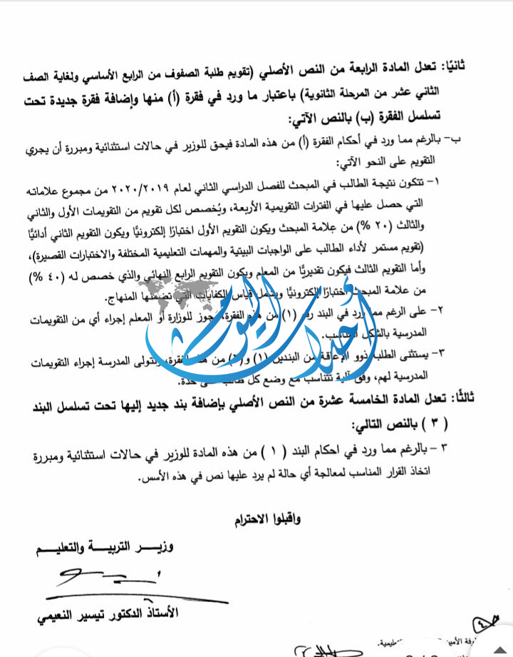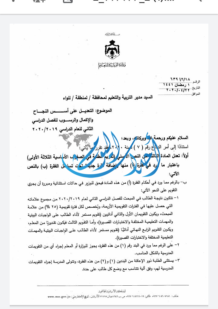 عممت وزير التربية والتعليم تيسير النعيمي صباح اليوم الأربعاء على مدراء التربية بمختلف محافظات المملكة بتعديل أسس النجاح والإكمال والرسوب للفصل الثاني لعام 2019 -2020.