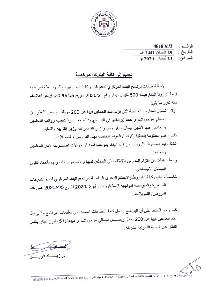 أحداث اليوم - عمم البنك المركزي الأردني الخميس، على البنوك كافة المرخصة لتعليمات برنامج البنك لدعم الشركات الصغيرة والمتوسطة لمواجهة أزمة فيروس كورونا المستجد، والبالغ قيمته 500 مليون دينار ليشمل المدارس الخاصة التي يزيد عدد العاملين فيها عن 200 موظف .