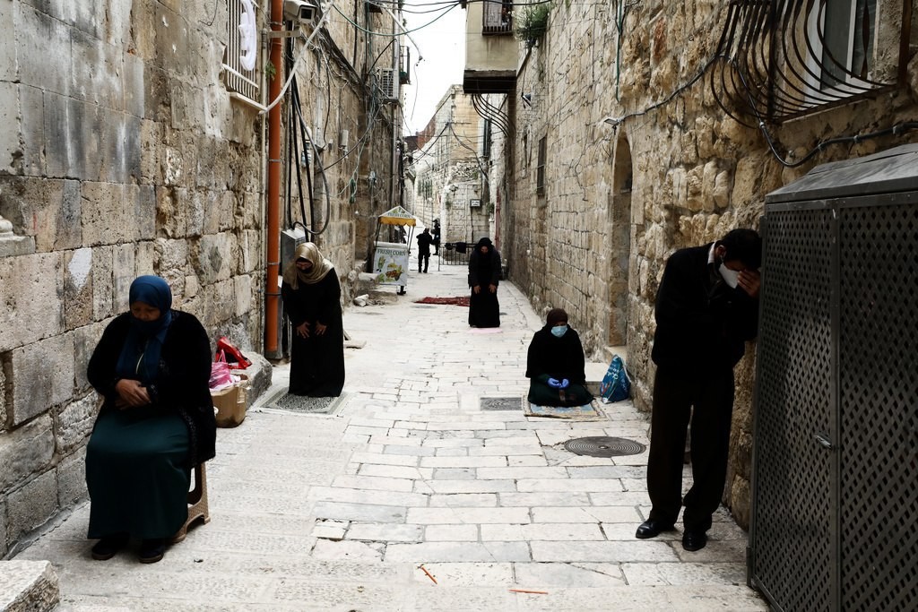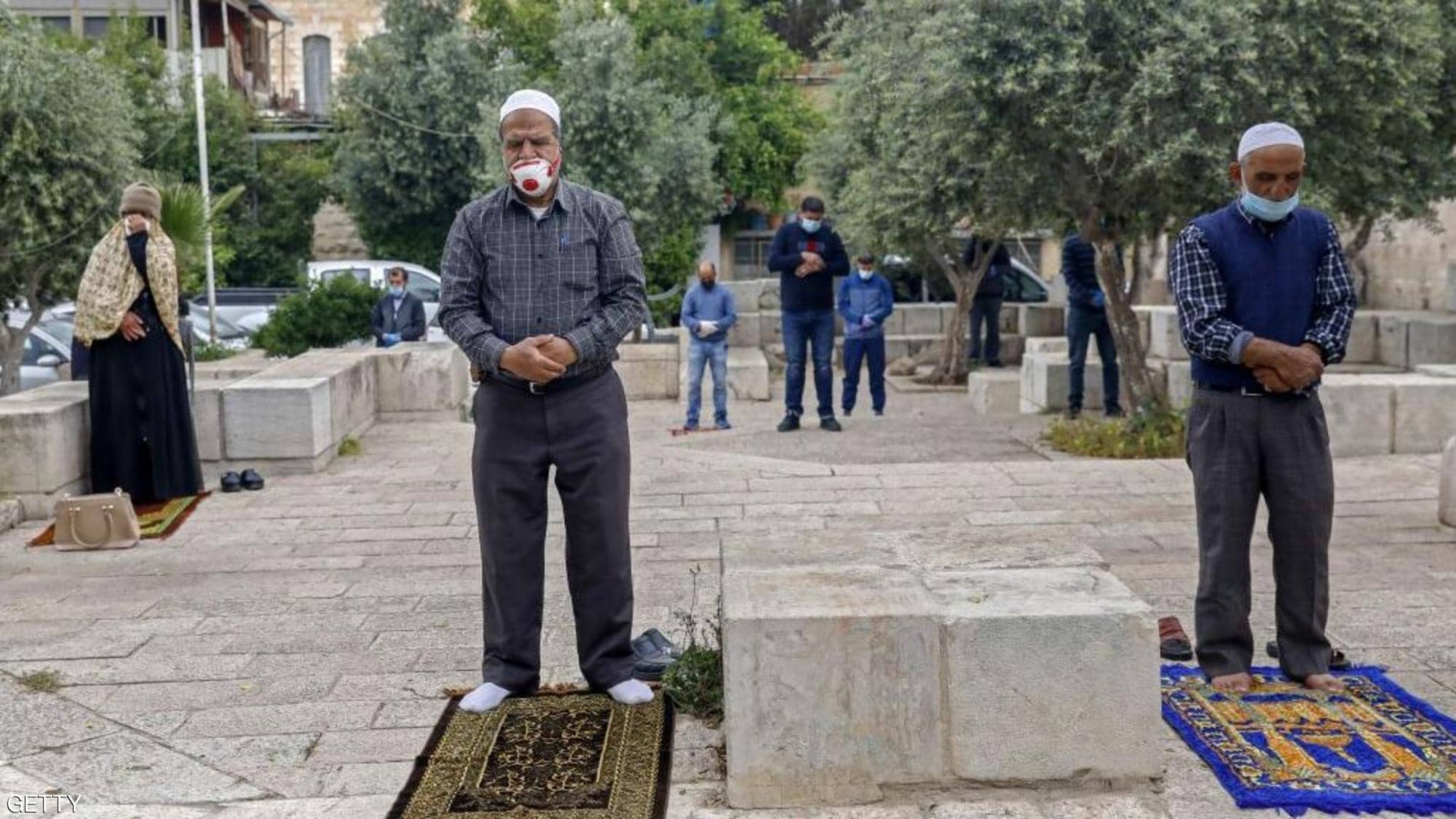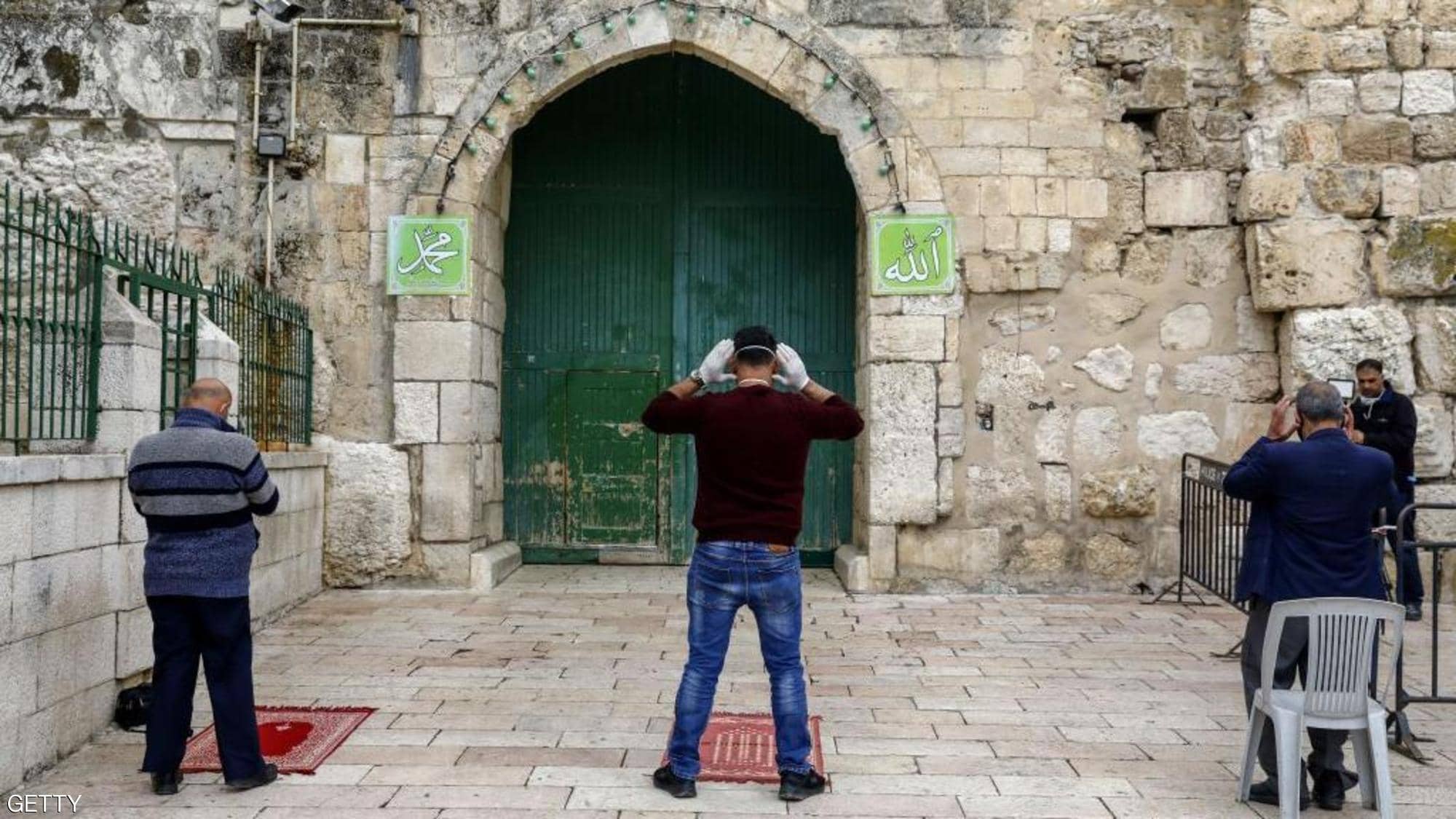 وفي مشاهد نادرة، ربما لم يشهدها الأقصى في تاريخه، جلس بضعة أشخاص من رجال الدين وهم يرتدون الكمامات ويحافظون على مسافات فيما بينهم امتثالا للقيود المفروضة بسبب وباء كورونا.