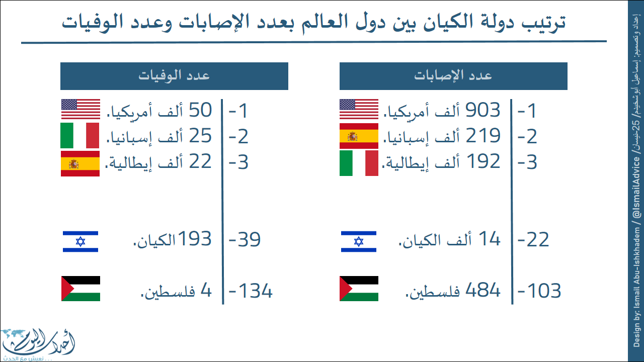 وتحتل دولة الكيان المرتبة 39 في عدد الوفيات مقابل المرتبة 134 للفلسطينيين، وبفارق 95 دولة.