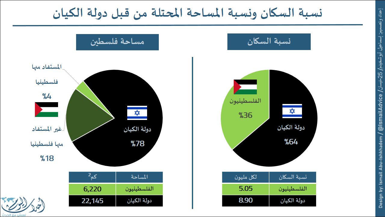 تحتل "إسرائيل" أربع أخماس (78%) دولة فلسطين التاريخية، لتترك الخمس (22%) فقط من مساحة الأرض لأكثر من 5 مليون فلسطيني يعيشون فيها تحت سيطرة الكيان على معظمها، حيث يمنع الكيان المحتل الفلسطينيين الاستفادة من أرضهم، إلا من سدسها فقط (4%)، ليستوطن 8.9 مليون محتل ومن يقبعون تحت الاحتلال في أغلب مساحة دولة فلسطين.