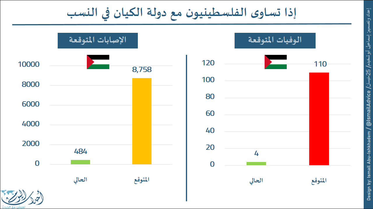 وإن ارتفاع نسبة الوفيات في الجانب الفلسطيني من 0.8/مليون نسمة إلى نسبة الكيان 22/مليون نسمة، سيرفع عدد الوفيات في الجانب الفلسطيني من 4 حالات إلى 110 حالة وفاة وبزيادة 106 حالة وفاة.