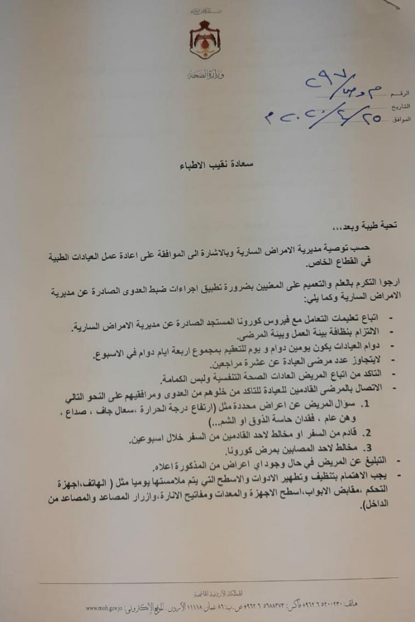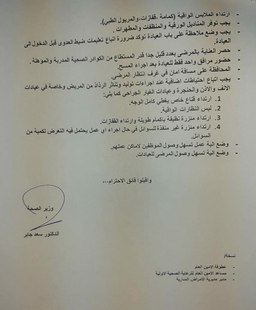 أحداث اليوم - ارسل وزير الصحة الدكتور سعد جابر الى نقيب الاطباء الدكتور علي العبوس اجراءات ضبط العدوى الصادرة عن مديرية الامراض السارية والمتعلقة بفتح العيادات.