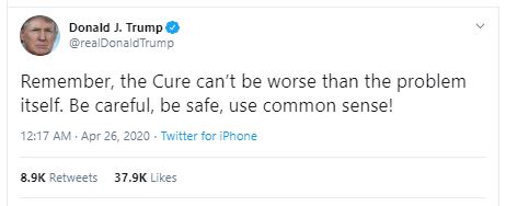 وأضاف: "الشعب الأمريكي لا يحصل على شيء سوى الأخبار المزيفة، لا تستحق الوقت والجهد"، وتابع: "تذكر أن العلاج لا يمكن أن يكون أسوأ من المشكلة نفسها كن حذر، كن آمنا، استخدم الحس السليم".