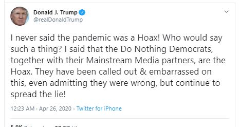 وقال دونالد ترامب، عبر حسابه بموقع تويتر: "لم أقل أبداً أن الوباء كان خدعة، من سيقول مثل هذا الشيء؟ قلت إن الديمقراطيين الذين لا يفعلون شيئًا إلى جانب شركائهم في وسائل الإعلام الرئيسية، هم خدعة، لقد تم استدعاؤهم وإحراجهم على هذا، حتى الاعتراف بأنهم كانوا مخطئين لكنهم يواصلون نشر الكذب".
