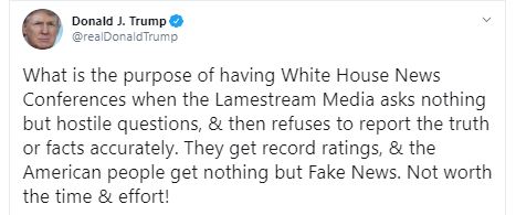 وأضاف: "ما هو الغرض من عقد مؤتمرات البيت الأبيض الإخبارية عندما لم تطرح وسائل الإعلام سوى أسئلة معادية، ثم ترفض الإبلاغ عن الحقيقة أو الحقائق بدقة".