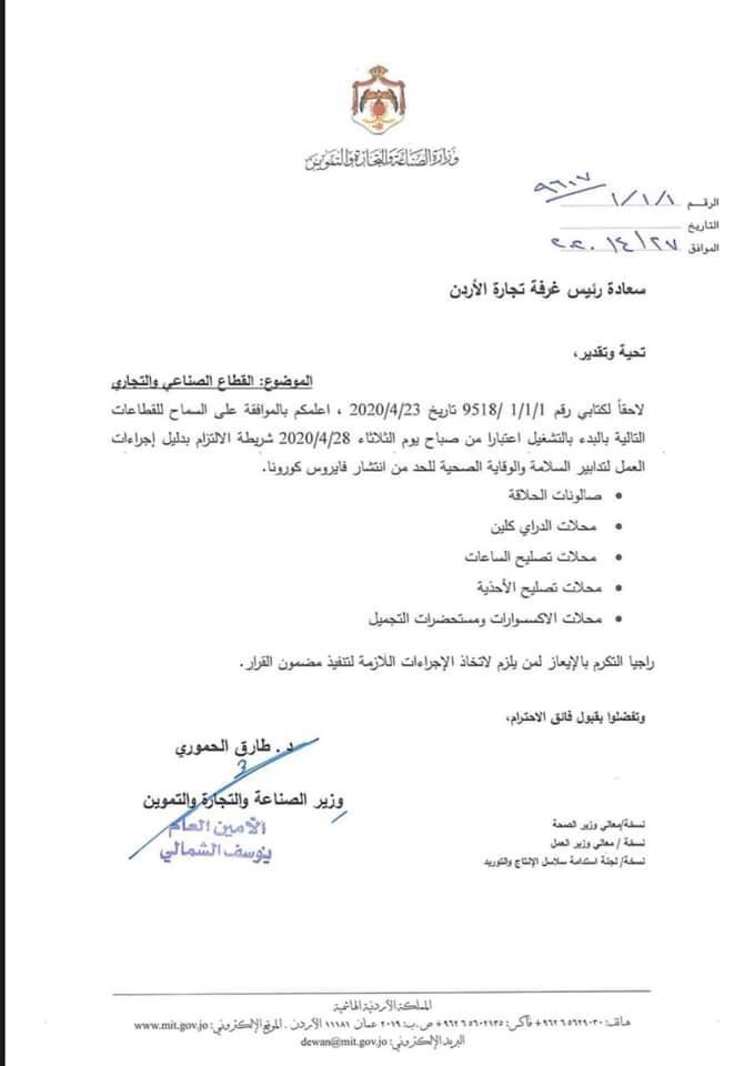 وقال الحموري خلال إيجاز صحفي من مركز الأمن وإدارة الأزمات: "فيما يتعلق بالقطاعات الجديدة فبعد التشاور مع وزير الصحة (سعد جابر) وتشاوره مع اللجان المختصة التابعة له، تقرر السماح لعدد من القطاعات بالمباشرة ببدء عملها مثل قطاع المدققين الماليين، والاستشارات الضريبية والمحاسبية والمديرين الماليين، وصالونات الحلاقة للرجال والسيدات محالات الدراي كلين، وتصليح الساعات والأخذية، ومحالات الاكسسوارات ومستحضرات التجميل".