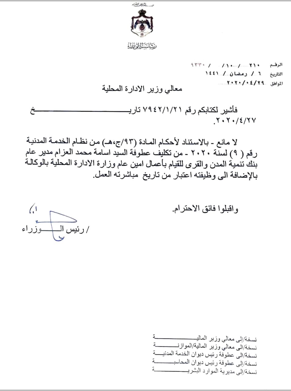 أحداث اليوم - وافق رئيس الوزراء الدكتور عمر الرزاز، على تنسيب وزير الإدارة المحلية المهندس وليد المصري، بتعيين مدير عام بنك تنمية المدن والقرى، أسامة العزام، أميناً عاماً لوزارة الإدارة المحلية بالوكالة، إلى جانب وظيفته وذلك عقب استقالة الأمين العام السابق، باسم الطراونة.