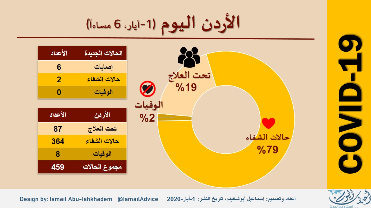 وسجلت الأردن على حدودها 6 حالات جديدة ليصبح مجموع عدد المصابين 459 حالة مسجلة.