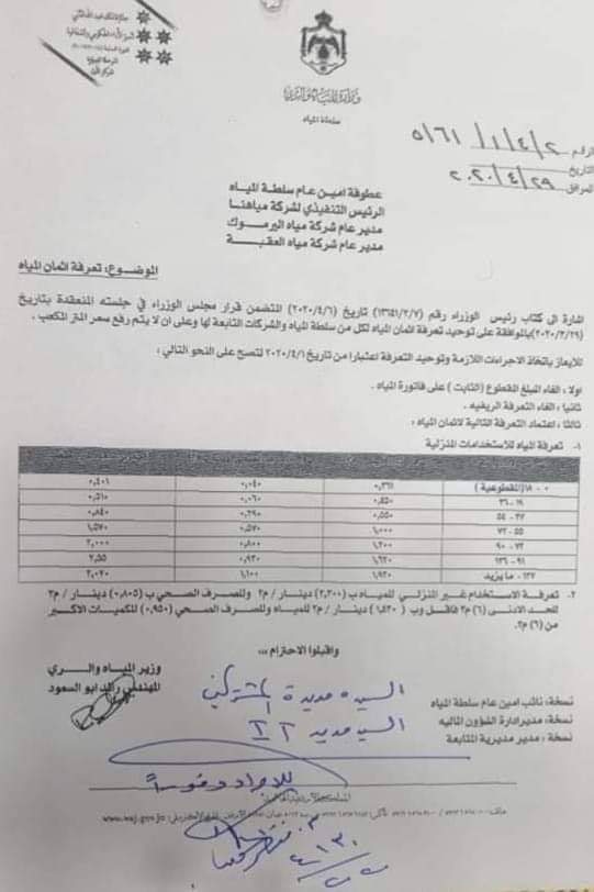 أحداث اليوم - قرر مجلس الوزراء الموافقة على توحيد تعرفة أثمان المياه لكل من سلطة المياه والشركات التابعة لها على أن لا يتم رفع سعر المتر المكعب.