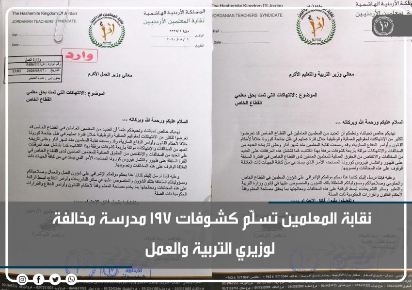 أحداث اليوم - قدمت نقابة المعلمين الأردنيين أربعة كشوفات لمخالفات مدارس خاصة تم رصدها خلال الفترة الماضية خلافا للقوانين وأوامر الدفاع في ما يخص رواتب المعلمين وحقوقهم الأخرى، وتم تسليم كشوفات المخالفات لوزيري التربية والتعليم والعمل.