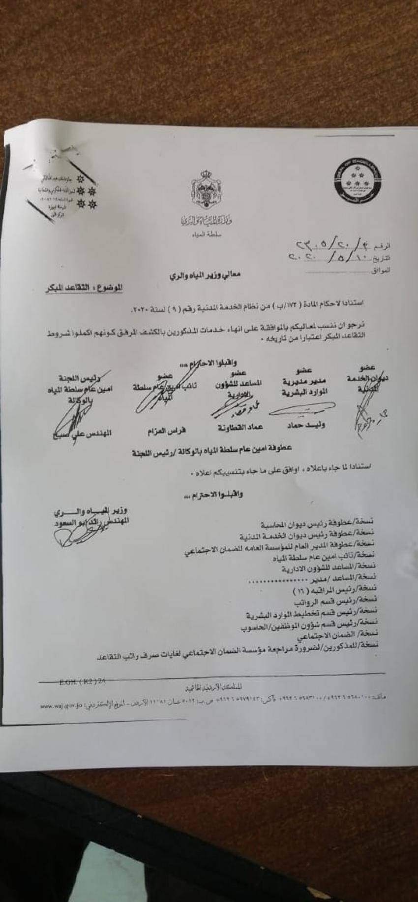 أحداث اليوم - وافق وزير المياه والري المهندس رائد أبو السعود على تنسيب لجنة مشكلة برئاسة أمين عام سلطة المياه بالوكالة المهندس علي صبح على إنهاء خدمات موظفين أتموا شروط التقاعد المبكر.