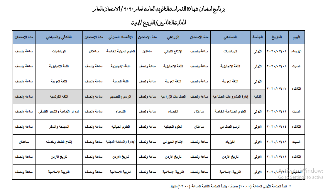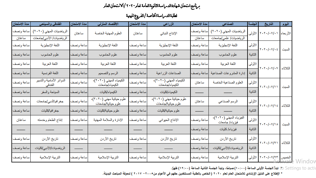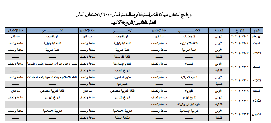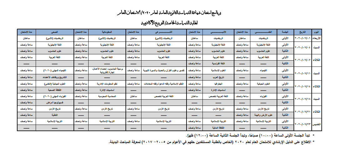 وسيبدأ الامتحان وفق البرنامج يوم الأربعاء ١ /٧ / ٢٠٢٠ وينتهي يوم الخميس٢٣ /٧ / ٢٠٢٠.