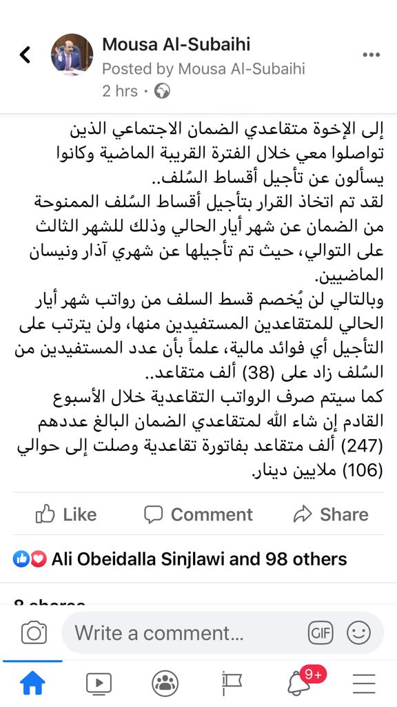 وأضاف الصبيحي في منشور له على موقع التواصل الاجتماعي فيسبوك، أنه صرف الرواتب سيكون لمتقاعدي الضمان البالغ عددهم (247) ألف متقاعد بفاتورة تقاعدية وصلت إلى حوالي (106) ملايين دينار.