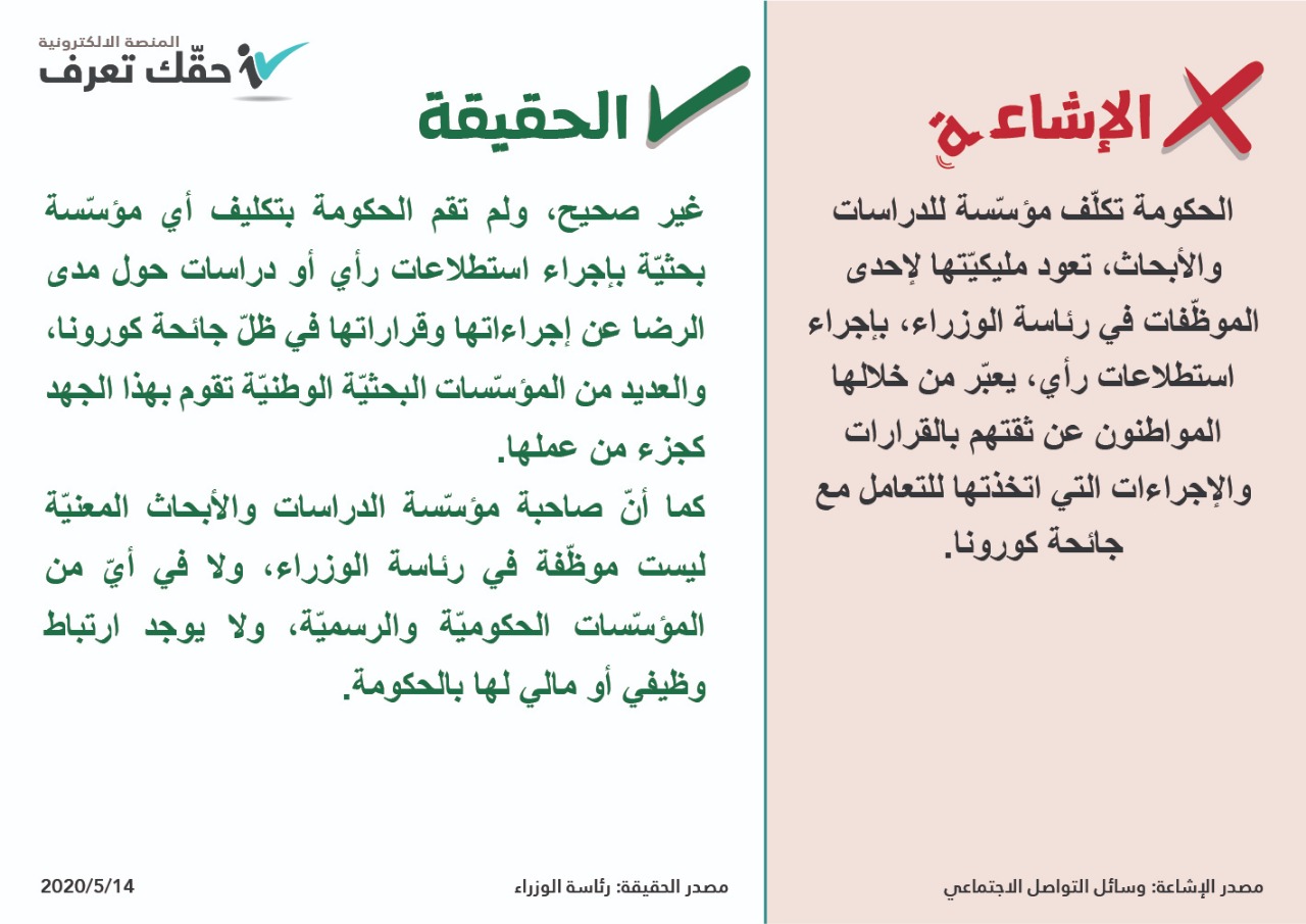 أحداث اليوم - قالت الحكومة أنها لم تكلّف أي مؤسّسة بحثيّة بإجراء استطلاعات رأي حول قراراتها لمواجهة “كورونا”.وأضافت أن صاحبة المؤسّسة التي أجرت إحدى الدراسات أخيراً ليست موظّفة في رئاسة الوزراء.