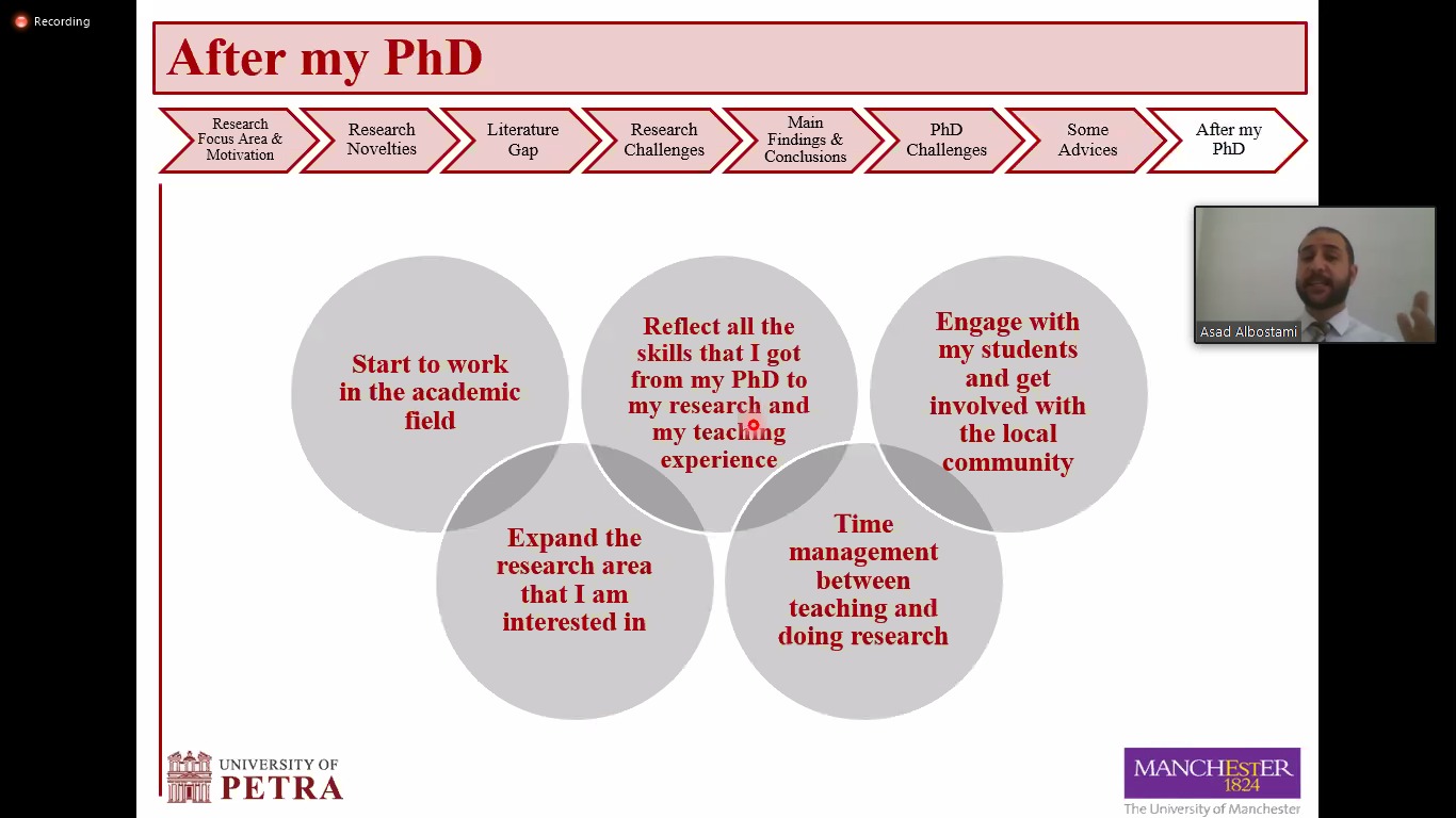 قدم البسطامي نبذة عن الأبحاث العلمية والمنشورات التي قام بها خلال مرحلة الدكتوراة، مستعرضًا التحديات والنتائج والتوصيات التي خرجت بها أبحاثه العلمية، والقدرة على إفادة المجتمع المحلي من هذه الأبحاث.
