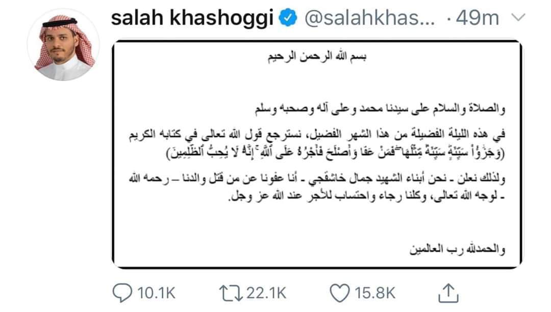 وكتب صلاح خاشقجي: "في هذه الليلة الفضيلة من هذا الشهر الفضيل، نسترجع قول الله تعالى في كتابه الكريم (وجزاء سيئة سيئة مثلها، فمن عفا وأصلح فأجره على الله إنه لا يحب الظالمين).