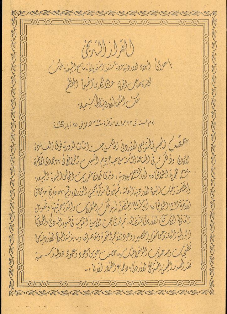 عقد المجلس التشريعي الاردني الخامس جلسته الثالثة لدورته فوق العادة الاولى وذلك في الساعة الثامنة من صباح يوم السبت الواقع في 23 جمادى الاخرة 1365 هجرية الموافق 25 أيار سنة 1946 ميلادية ، ولدى تلاوة مقررات المجالس البلدية المبلغة اليه والمتضمنة رغبات البلاد الاردنية العامة ، تم تلاوة مذكرة مجلس الوزراء رقم 521 بتاريخ 13 جمادى الاخرة 1365 الموافق 15/5/1946 المتضمنة تاييد تلك المقررات واقتراح تلبيتها وتعديل القانون الاساسي الاردني بمقتضاها ثم لدى بحث الاماني القومية في ضوء المبادىء والمواثيق الدولية العامة وحق تقرير المصير ووعود الامم التحدة ومقاصدها وما بذلته البلاد الاردنية من تضحيات ومساعدات للديموقراطيات وما حصلت عليه من وعود وعهود دولية رسمية فقد اصدر المجلس التشريعي الاردني بالاجماع القرار التاريخي الآتي :