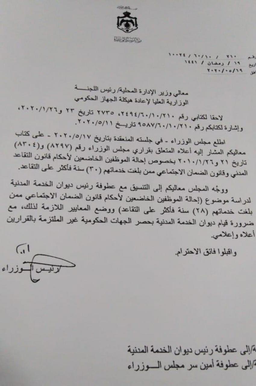 وجه رئيس الوزراء الدكتور عمر الرزاز كتاباً لوزير الادارة المحلية - رئيس اللجنة الوزارية العليا المشكلة لاعادة هيكلة الجهاز الحكومي وليد المصري يتعلق بدراسة (احالة الموظفين الخاضعين لأحكام قانون الضمان الاجتماعي ممن بلغت خدماتهم 28 سنة فأكثر إلى التقاعد) ووضع المعايير اللازمة لذلك.