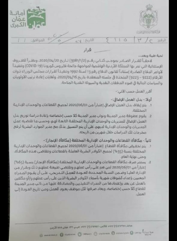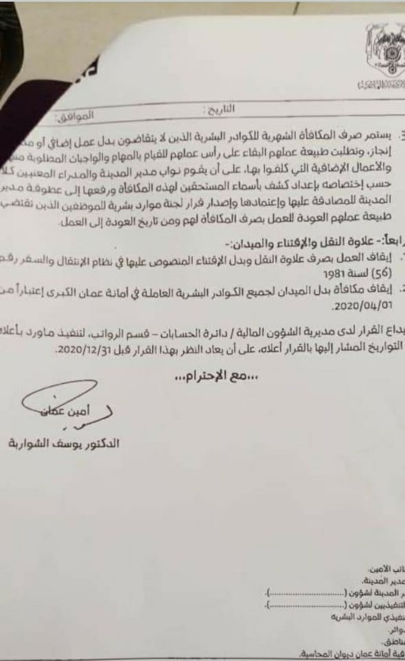 قالت أمانة عمان إن القرار الصادر عنها حول ايقاف بدل العمل الإضافي وتخفيض 35 % من مكافئات بدل الإنجاز للقطاعات جاء دون المساس براتب الموظف أو العامل وانما هذه الإمتيازات على راتب الموظف.