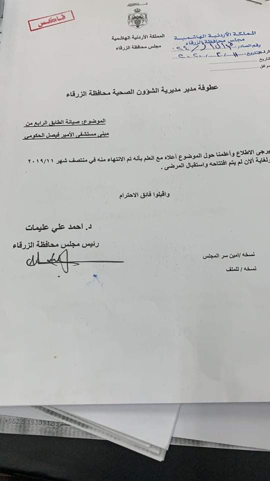 عاطف الوريدات- أوعز وزير الصحة سعد جابر خلال زيارته الأخيرة لمدينة الرصيفة بتجهيز الطابق الرابع في مستشفى الأمير فيصل الذي يفصلنا ايام عن افتتاحه الرسمي بحسب رئيس مجلس محافظة الزرقاء أحمد عليمات.