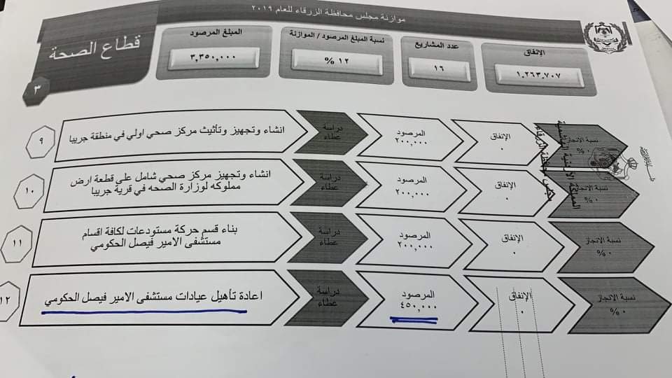 واضاف عليمات أن المشروع أقر في موازنة مجلس محافظة الزرقاء 2019 و بقيمة 400 الف دينار اردني بالاضافة لعدة مشاريع منها مشروع تطوير وتحسين المراكز الصحية في المحافظة