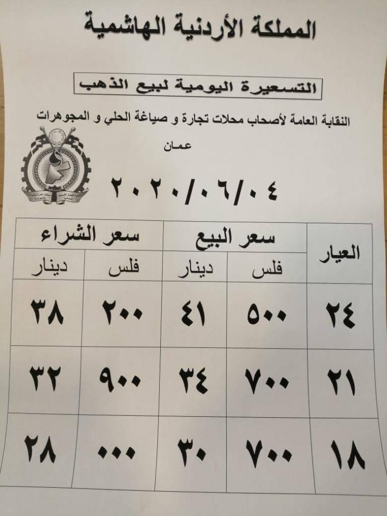 وسجل غرام الذهب عيار 21 الأكثر رغبة من قبل الأردنيين، 34.70 دينار لسعر البيع من قبل محال الذهب، و32.90 لسعر الشراء.