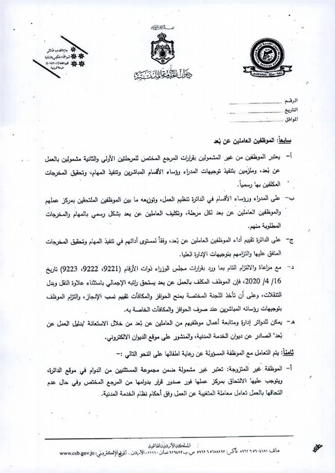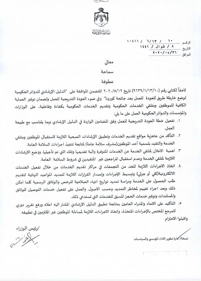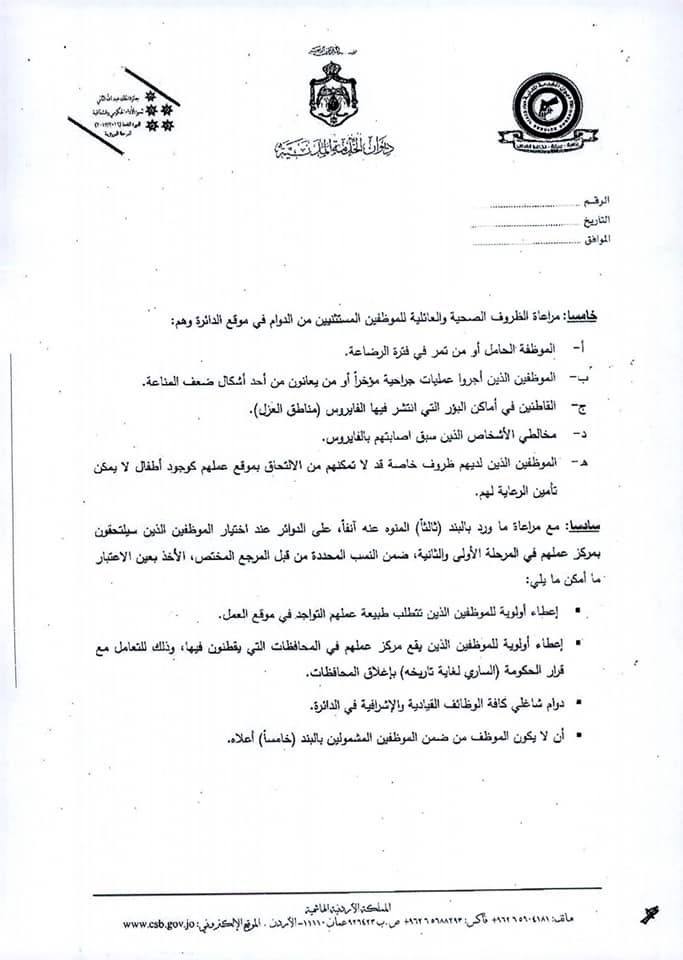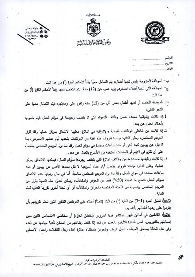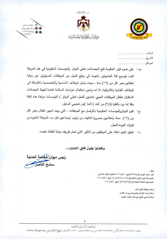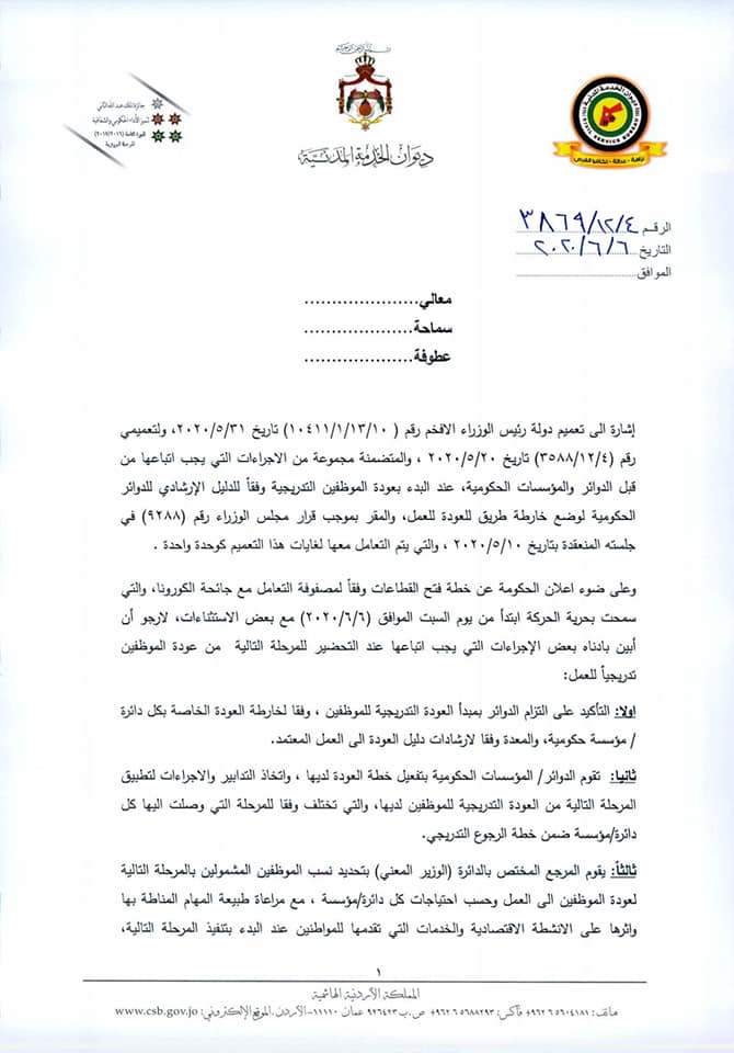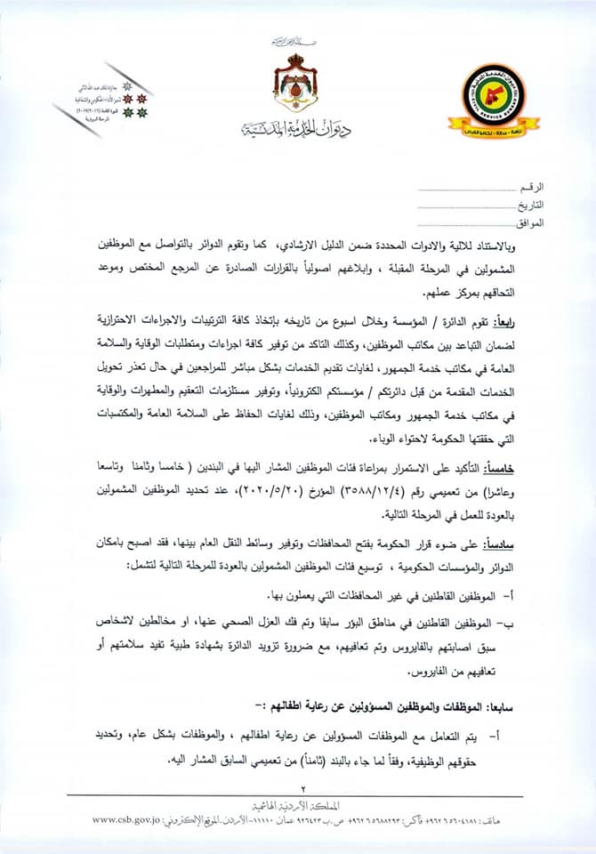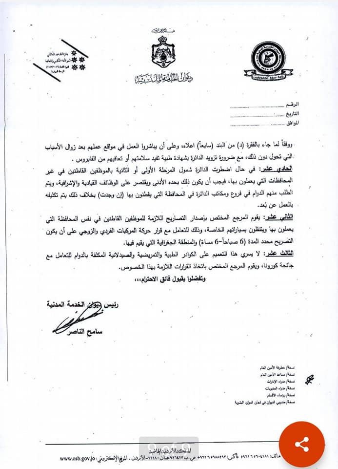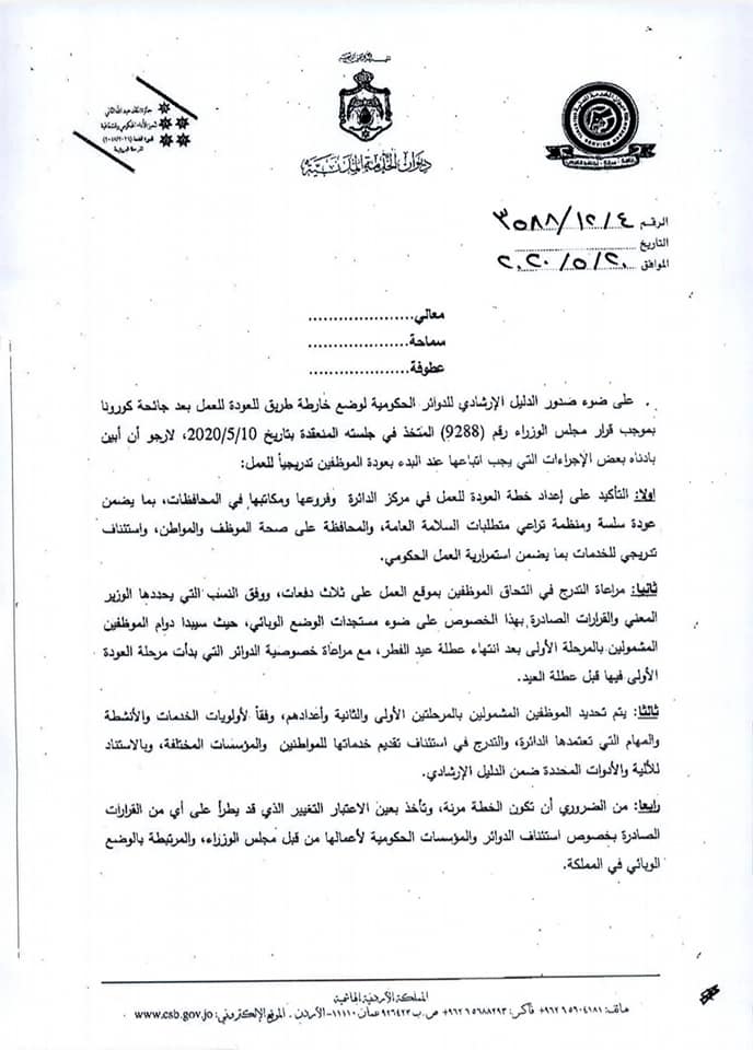 وجاء في التعميم أنه في ضوء قرار الحكومة فتح المحافظات وتوفير وسائط النقل العام بينها، فقد أصبح بإمكان الدوائر والمؤسسات توسيع فئات الموظفين المشمولين بالعودة إلى العمل من فئات : الموظفون القاطنون في غير المحافظات التي يعملون بها، بالإضافة إلى القاطنين في مناطق البؤر التي تم فك العزل الصحي عنها أو مخالطين لأشخاص سبق إصابتهم بالفيروس وتعافوا، مع ضرورة تزويد الدائرة بشهادة طبية تفيد بسلامتهم أو تعافيهم من الفيروس.