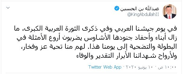 هنأ الملك عبدالله الثاني بمناسبة يوم الجيش و ذكرى الثورة العربية الكبرى.
