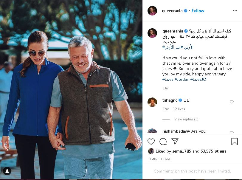 نشرت الملكة رانيا العبدالله صورة تجمعها بالملك عبدالله الثاني عبر حسابها الخاص على "الإنستغرام".وعلقت الملكة على الصورة: كيف لحبي لك ألا يزيد كل يوم؟ فابتسامتك تضيء حياتي منذ 27 سنة... عيد زواج سعيد سيدنا.
