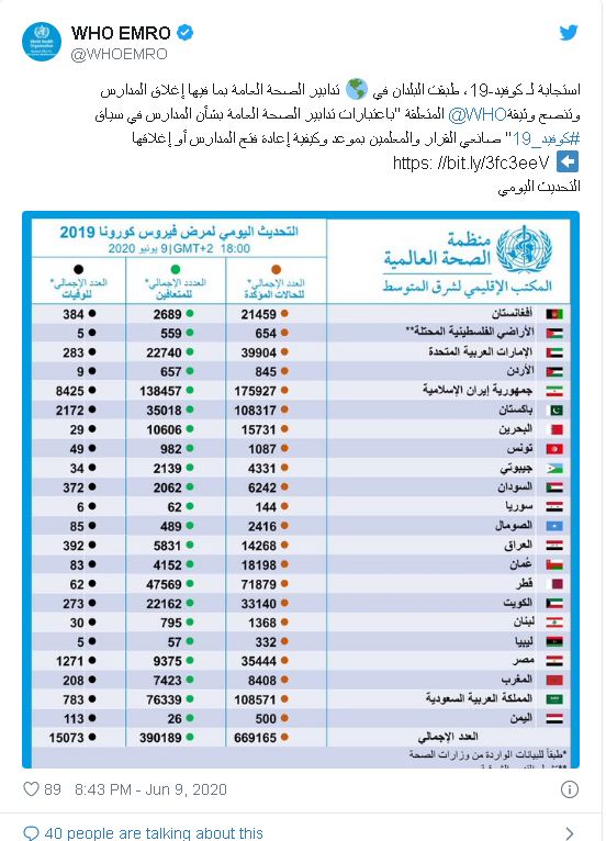 وقالت منظمة الصحة العالمية، إن هذه دول الشرق الاوسط، من بينها الاردن، تنصح صانعي القرار والمعلمين باعلان "موعد وكيفية إعادة فتح المدارس أو إغلاقها".