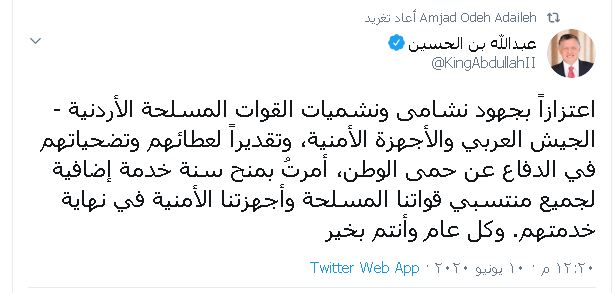 وقال الملك في تغريدة على تويتر، مساء الاربعاء، اعتزازاً بجهود نشامى ونشميات القوات المسلحة الأردنية - الجيش العربي والأجهزة الأمنية، وتقديراً لعطائهم وتضحياتهم في الدفاع عن حمى الوطن، أمرتُ بمنح سنة خدمة إضافية لجميع منتسبي قواتنا المسلحة وأجهزتنا الأمنية في نهاية خدمتهم. وكل عاموأنتم بخير