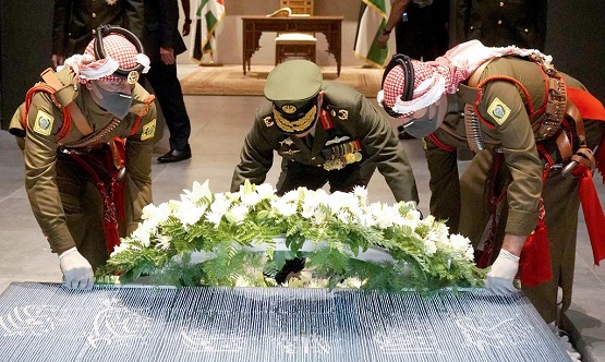 ووضع الملك إكليلاً من الزهور على ضريح الجندي المجهول، وقرأ والحضور الفاتحة على أرواح الشهداء الأبرار، الذين رووا بدمائهم الزكية ثرى الوطن وثرى فلسطين، وقدموا أروع صور التضحية والفداء دفاعاً عن الوطن والحق، فيما دعا مفتي القوات المسلحة بالرحمة والغفران للشهداء الأبرار.
