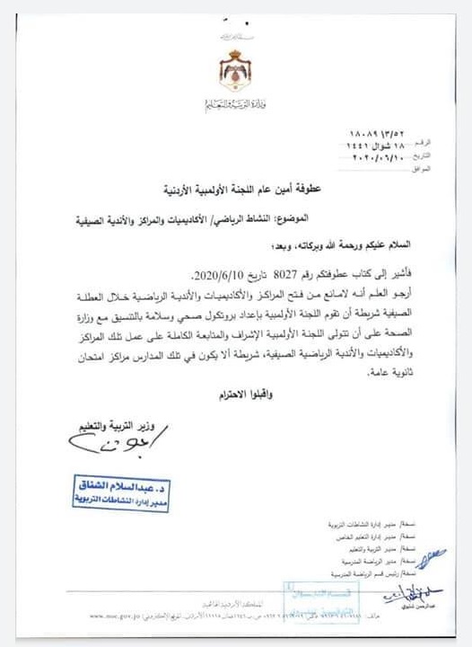 وقالت وزارة التربية والتعليم في كتابها الرسمي، انها لا تمانع إعادة فتح هذه المنشآت الرياضية، شريطة أن تقوم اللجنة الأولمبية بإعداد بروتكول صحي بالتنسيق مع وزارة الصحة.