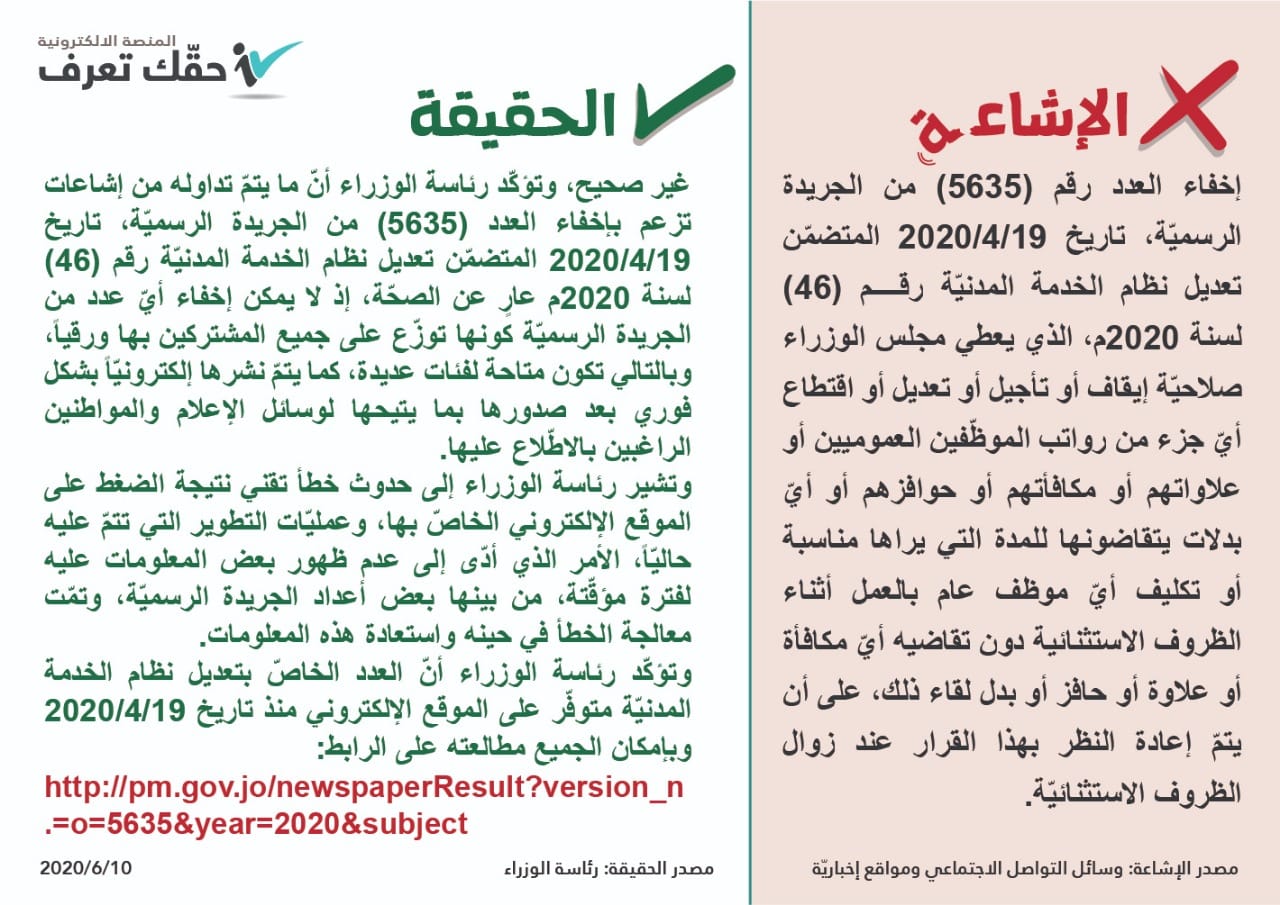 أحداث اليوم - نفت الحكومة عبر منصة "حقك تعرف" إشاعات حول إخفاء العدد (5635) من الجريدة الرسميّة.