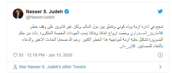 وكتب جودة في تغريدة له عبر حسابه على تويتر "ننجح في ادارة ازمة وباء كوني ونتميّز بين دول العالم، ولكن غير قادرين على وقف خطر الطريق الصحراوي وحصد ارواح ابنائنا وبناتنا بسب الحوداث المفجعة المتكررة".
