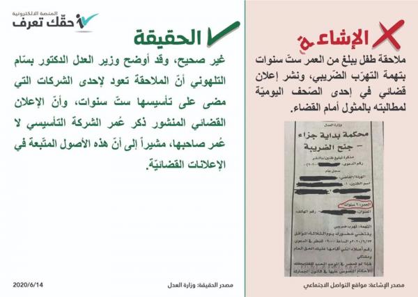 أحداث اليوم - أكدت الحكومة أن الادعاءات بملاحقة طفل يبلغ من العمر 6 سنوات بتهمة التهرب الضريبي ونشر اعلان قضائي في احدى الصحف اليومية لمطالبته بالمثول أمام القضاء غير صحيحة.