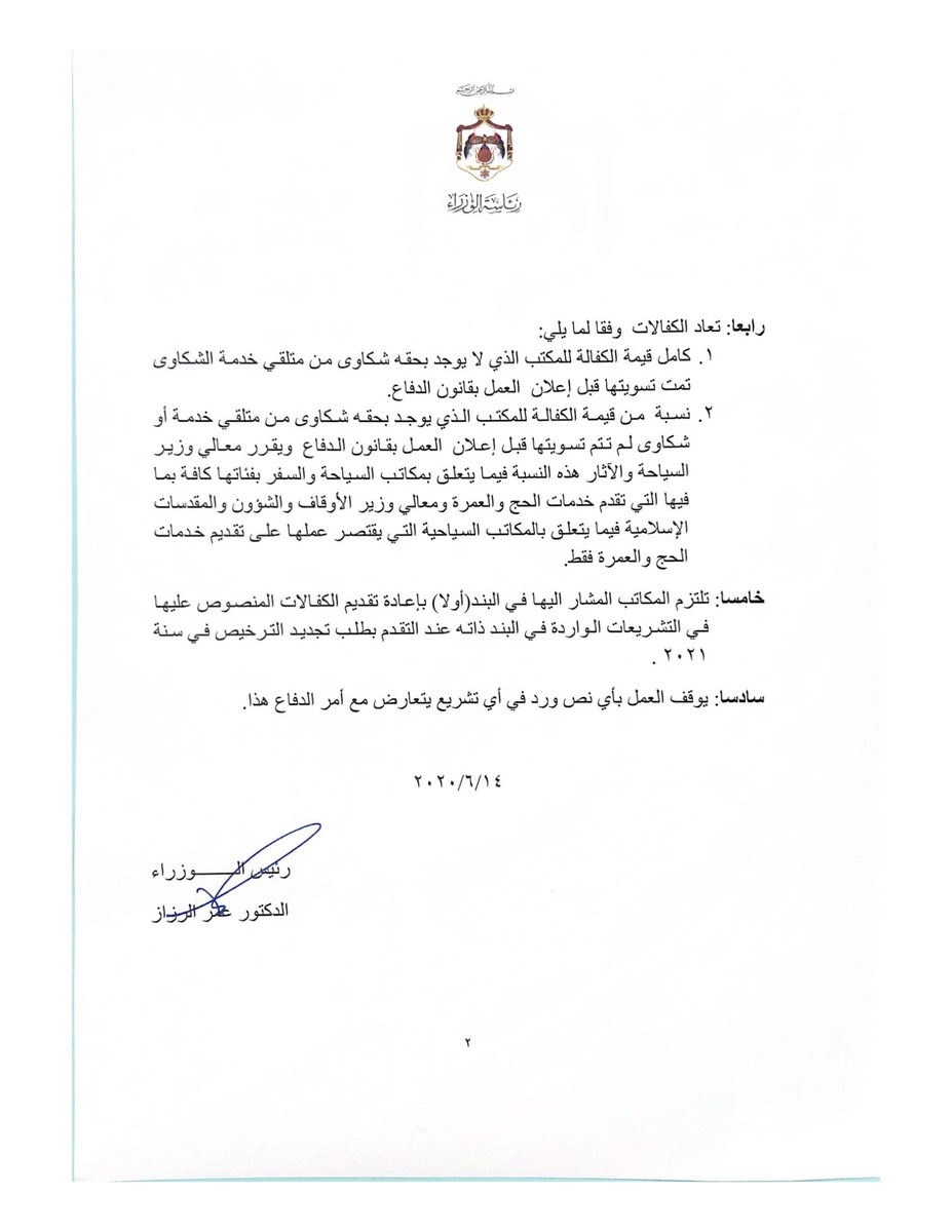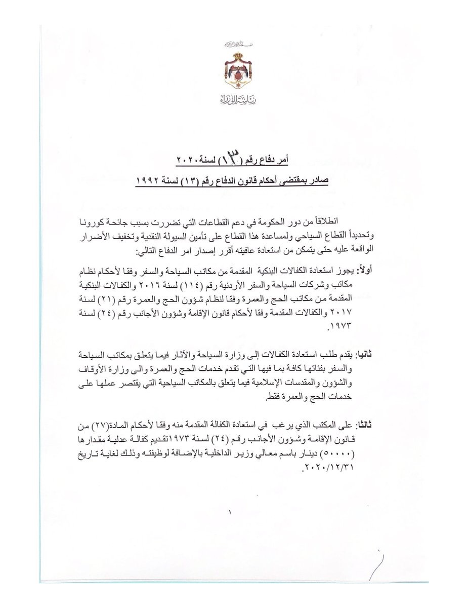 أحداث اليوم - صدر في الجريدة الرسمية، الإثنين، أمر دفاع رقم 13 لسنة 2020، والذي يُعني بدعم القطاعات التي تضررت بسبب جائحة كورونا، وتحديدا القطاع السياحي.وتاليا نص القانون:
