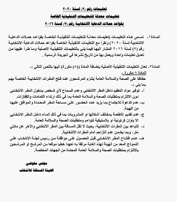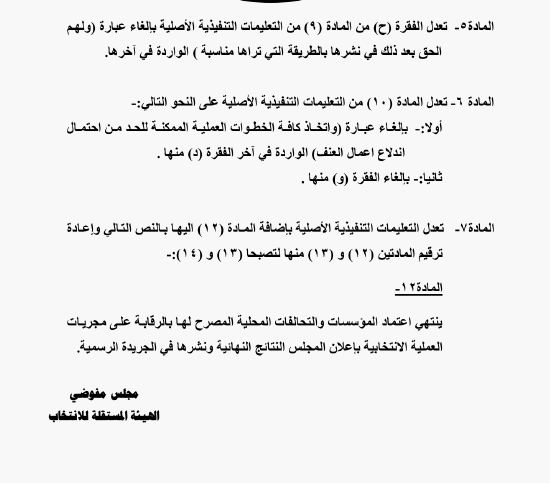 كما صدر تعليمات معدلة للتعليمات التنفيذية الخاصة بقواعد حملات الدعاية الانتخابية رقم (7) لسنة 2016، والتعليمات معدلة للتعليمات التنفيذية الخاصة باعتماد المراقبين المحليين للعملية الانتخابية رقم (3) لسنة 2016.