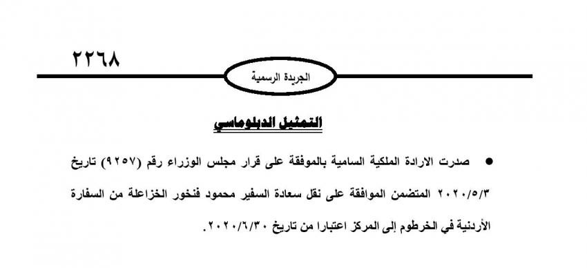 أحداث اليوم - صدرت الارادة الملكية السامية بالموافقة على قرار مجلس الوزراء المتضمن نقل السفير محمود الخزاعلة من السفارة الأردنية في خرطوم إلى مركز وزارة الخارجية.