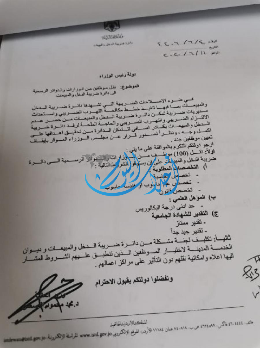 العسعس يطلب نقل 100 موظف للضريبة - وثيقة